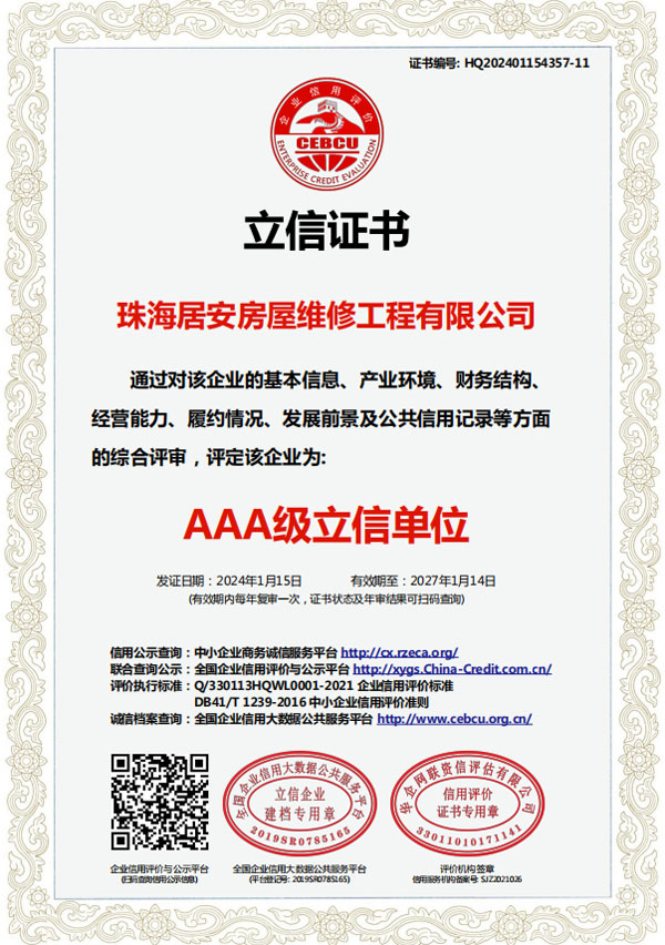 珠海居安房屋維修工程有限公司成立于2020年,是一家專注房屋維修的公司。我們擁有各類型專業(yè)人才,業(yè)務包括老舊建筑翻新改造、外墻空鼓修復、防水幕墻養(yǎng)護、外墻預置構(gòu)件拆除更換、供排水管網(wǎng)改造、墻面翻新、鋼制結(jié)構(gòu)建筑構(gòu)建及折除,外墻清洗及裝修裝飾。